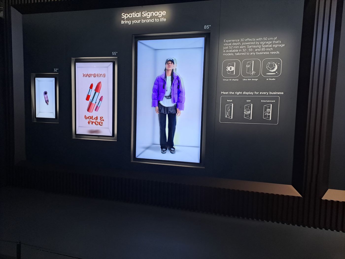 La nueva Spatial Signate, de diseño ultrafino, con un perfil de solo 52 mm de grosor y un peso de 49 kg, es compatible con el soporte de pared Slim Fit, lo que permite instalarla como una pantalla de señalización convencional e integrarla fácilmente en espacios reducidos o sensibles al diseño sin tener que incluir otras estructuras voluminosas. Según anunció el fabricante, está previsto el lanzamiento de otros modelos Spatial Signae de 32 y 55”.